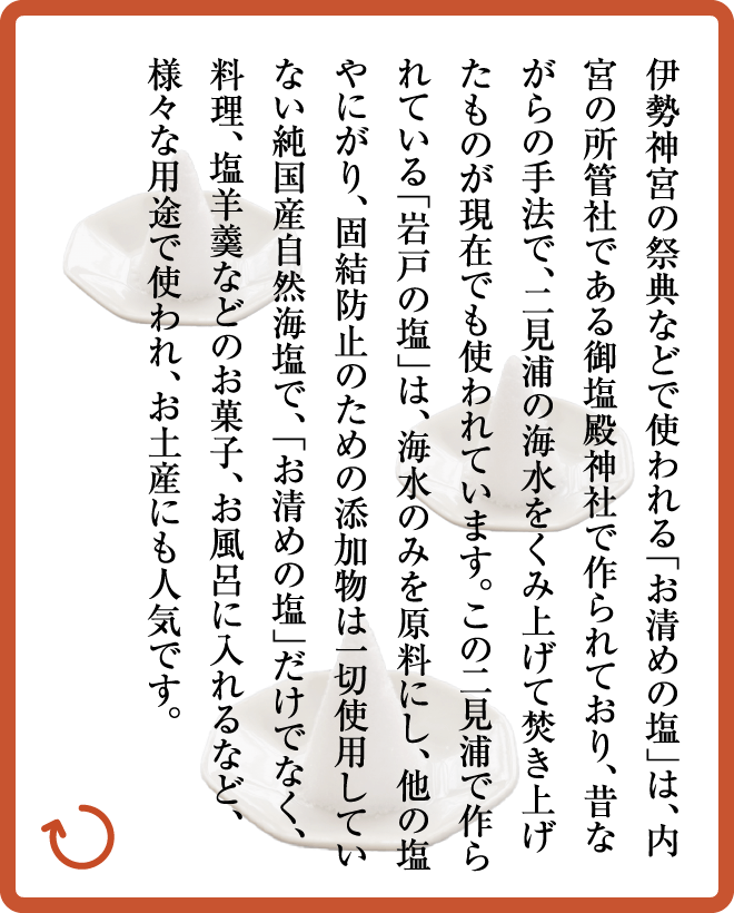 古くから旅人をもてなす食べ物としてお餅が親しまれてきました。中でも「赤福餅」は全国的にも有名ですが、市内には「へんば餅」「二軒茶屋餅」など、地域ごとに受け継がれる名物餅が点在しています。素朴でやさしい味わいは、伊勢の人々のおもてなしの心そのものです。
