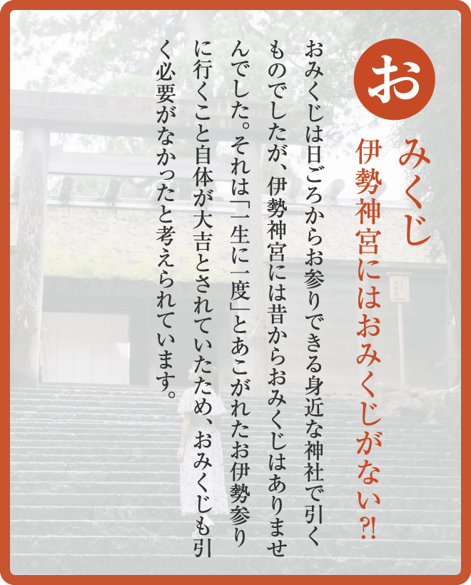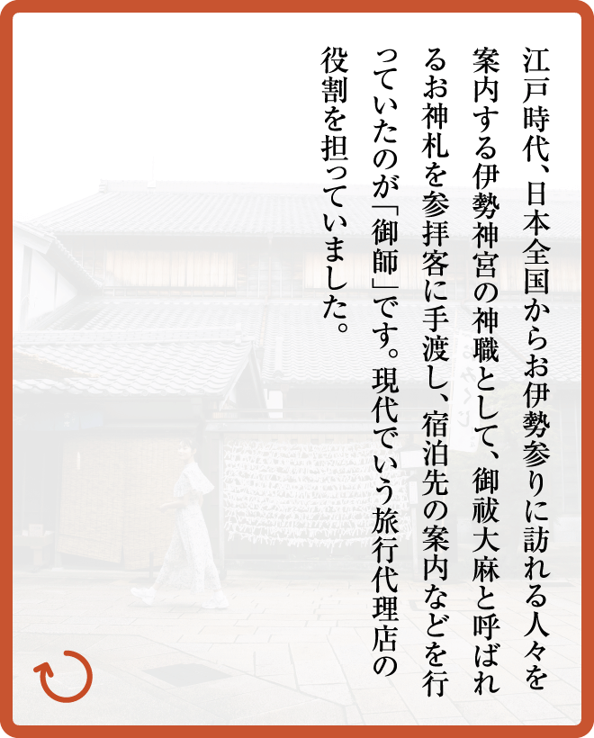 伊勢神宮だけじゃない、もうひとつの伊勢の楽しみ。風情ある町並み、歴史に触れる街角、海辺の神聖な景色。伊勢のまち歩きは、時を超える旅のような体験です。